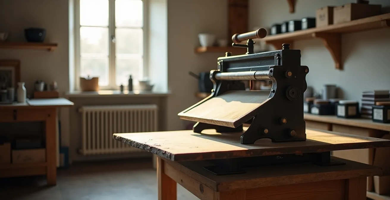 Die Presse ist das Herzstück deiner Werkstatt und die größte Investition in Platz und Geld. Die gängige Meinung lautet oft, größer sei immer besser. Doch auf 15 qm ist das ein fataler Irrglaube. Für Editionen bis zum Format A3 (29,7 x 42 cm) ist eine hochwertige Tischpresse oft die überlegene Wahl. Sie benötigt keinen eigenen Standplatz auf dem Boden, sondern kann auf einem stabilen, selbstgebauten Untertisch platziert werden, der gleichzeitig als Stauraum für Farben und Werkzeuge dient. Dies ist ein entscheidender Vorteil für die Raumoptimierung.