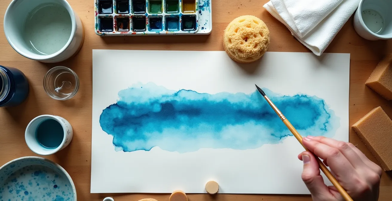 Die Frustration ist fast greifbar: Du trägst mit viel Hoffnung einen wunderschönen, saftigen Farbverlauf auf, doch statt eines sanften Übergangs entstehen unkontrollierbare Pfützen, hässliche Ränder und der gefürchtete „Blumenkohl-Effekt“. Viele Ratgeber empfehlen dann, einfach teureres Material zu kaufen oder „das Wasser machen zu lassen“. Doch diese Ratschläge übersehen den Kern des Problems. Es geht nicht darum, die Kontrolle an das Chaos abzugeben, sondern darum, einen bewussten Dialog mit dem Wasser zu führen.